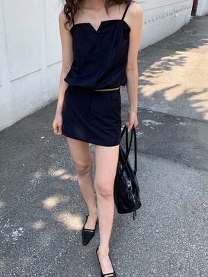 Mini skirt with built-in shorts, cargo pockets, belt loop, zipper and clasp fastening, and two side pockets. Available in sizes XS/S and M. Color: Black. Fabric: 70% Polyester, 30% Rayon.