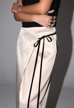 One Size: XS-L Color: Tan Black Velvet String Fastening Wrap Skirt Satin Finish Lined 49% Polyester 30% Rayon 21% Linen Measurements: Waist: 24-48in / 61-122cm Length: 35in / 89cm