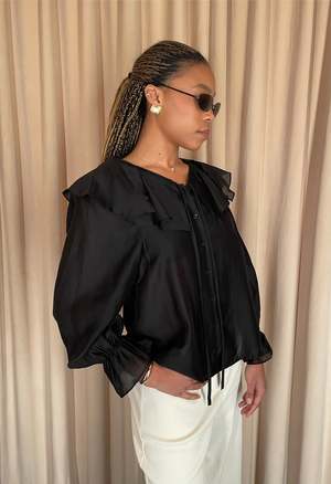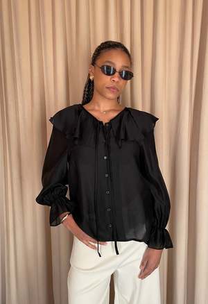The Demi Blouse from The NKC Store is a one-size, long sleeve poplin-style blouse that fits approximately XSM. It features a button front, V-neckline with tie at the chest, and bubble sleeves. The fabric is a sheer, lightweight material. Color: Black. Material: 70% Tencel, 30% Polyester.