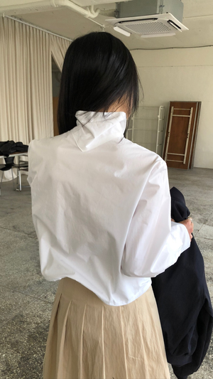 One size fits XSM. White button-down top with wire boning and a structured silhouette. Features buttoned cuffs and a double-button collar. 100% Cotton. Dry clean only.
