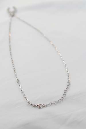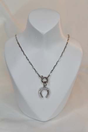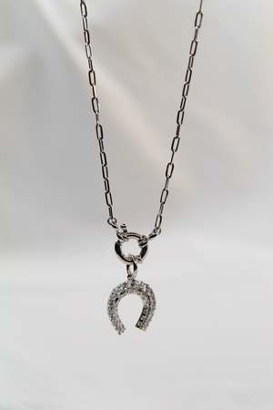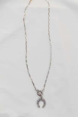925 Sterling Silver necklace featuring a removable horseshoe crystal pendant and a spring ring clasp. Minimum chain length: 16". Maximum chain length: 17.5". Horseshoe pendant measurements: 15mm x 15mm.