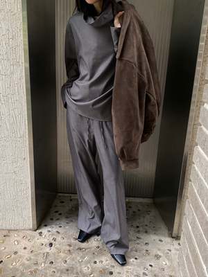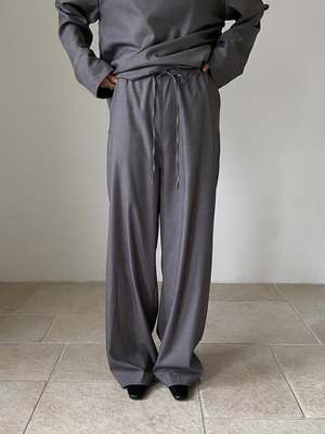 Straight leg pants with a drawstring waist tie, side pockets, and a loose fit. One size: fits approximately XSL. Color: Grey Fabric: 63% Polyester, 30% Rayon, 5% Wool, 2% Spandex.