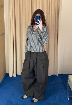 Max Cargo Pants by The NKC Store. One size fits XSXL. Adjustable elastic waist. Lightweight fabric with a baggy fit. 100% cotton. Dry clean recommended. Color: Grey Product measurements: Waist: 86.36 cm / 34 in Inseam: 66 cm / 26 in