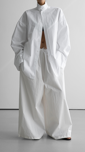 One size fits XS-L. Color: White Wide leg trousers Pressed seam Elastic waist Cord lock at waist and ankles Side pockets 65% Cotton, 35% Nylon Dry clean only.