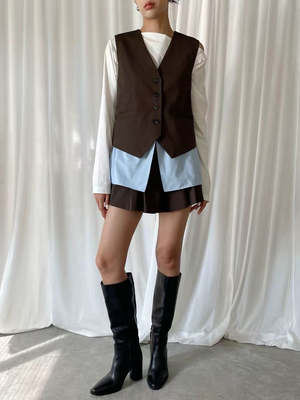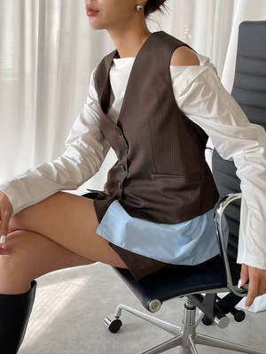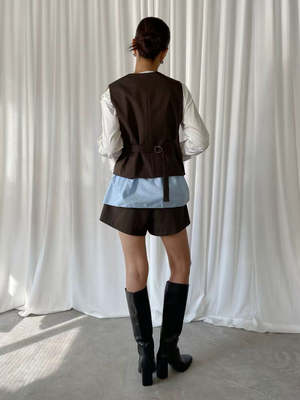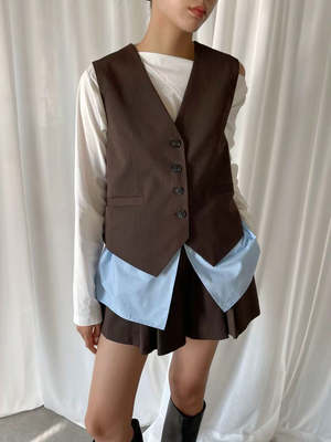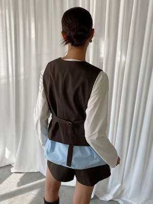 Button-up vest in brown and blue pinstripe with sleeveless design. Features two mock pockets in front, blue cotton peek-a-boo hemline, and adjustable cinch at back. 67% Polyester, 29% Rayon, 4% Spandex. Measurements: Bust: 36in / 92cm Length: 26in / 67cm