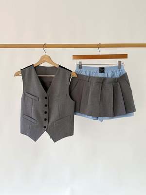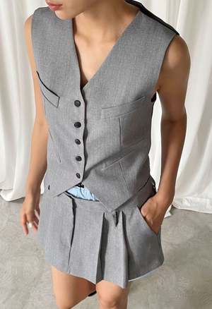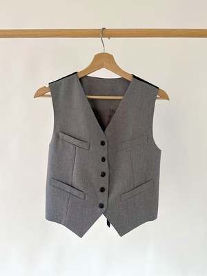 Button up vest with black satin back detail and four decorative front pockets. Adjustable fastening in the back. 100% Polyester Dry clean only. Product measurements: Bust: 34in / 86cm Length: 21.50in / 55cm