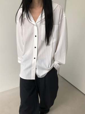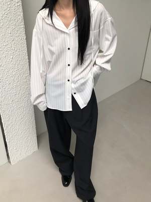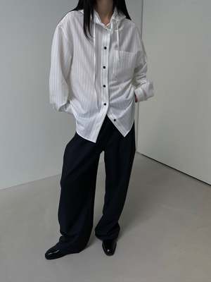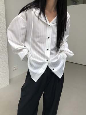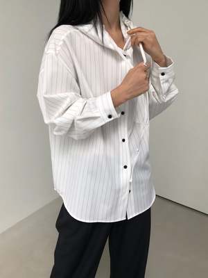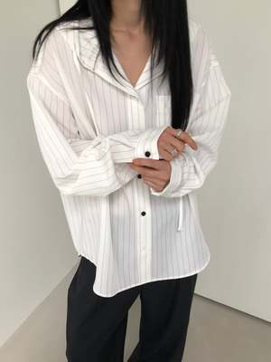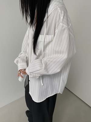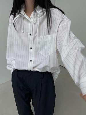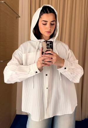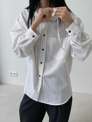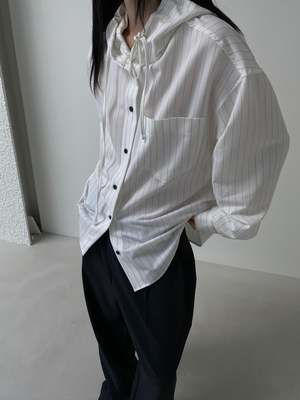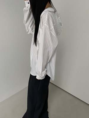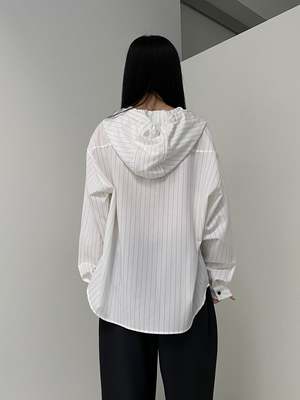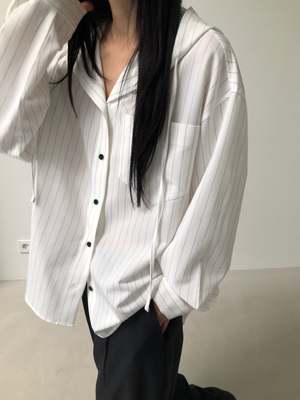 A hooded shirt/jacket featuring white with black stripes. Includes tie fastenings for the hood, black buttons, and long sleeves. One size fits XS-XL. 62% Polyester, 30% Cotton, 8% Spandex.