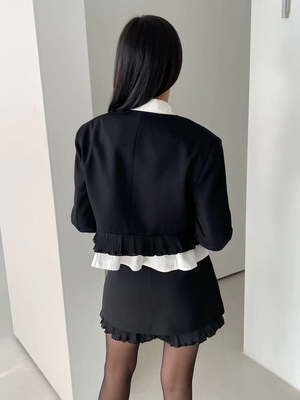 Cropped button up jacket set with long sleeves and layered ruffle detail on hem and sleeves. Features black and silver button detail. 80% Polyester, 10% Tencel, 10% Wool. Dry clean only.