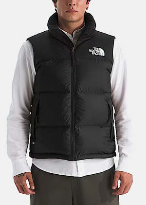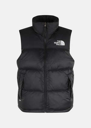 Retro Nuptse vest in black with a high neck, front zip fastening, and a quilted design. Outer: 100% Nylon Lining: 80% Down, 20% Duck Feathers Made in Bangladesh.