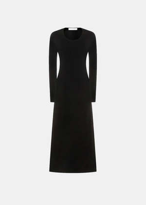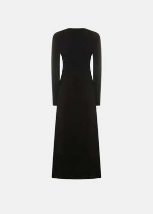 The Mavy dress from The Row features long sleeves, a round neckline, and a full-length silhouette in black with a soft, comfortable fit. 67% Viscose, 33% Polyester. Made in Italy.