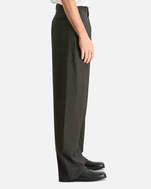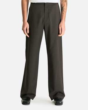 The Mista Pant by The Row is crafted from a lightweight mohair and wool blend, offering a mid-rise fit with a zip fly and button closure. Features include 4-pocket styling, adjustable waist with button fastening, twisted seams, belt loops, and full lining. Model is 6'3" with a 30" waist and wears size 32. Main: 84% wool, 16% mohair. Lined: 100% cotton. Made in Italy.