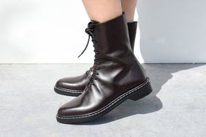 The Row /// Leather boot in a deep midnight brown, so dark it appears black in certain lighting. The Fara Ankle Boot includes both laces and a concealed side zip fastening for easy on-and-off. Designed with reinforced heel counter, tapered toe, form-fitting shape, and moderately narrow ankle opening for flattering fit. This smooth almost-black boot includes narrow black laces, raw eyelets, and a tonal cotton twill pull tab concealed within. Features stacked leather heel, sole, and goodyear welt with contrasting white stitching along edge. Outsole displays tonal black stripes of leather and rubber for grip. Interior is fully lined with supple, smooth leather. Detailed with shiny silver tone brand-embossed pull tab at zip. Runs true to size Heel measures approximately 1.5" 100% Leather Made in Italy