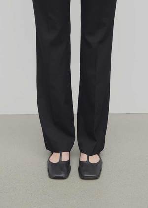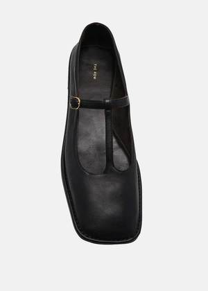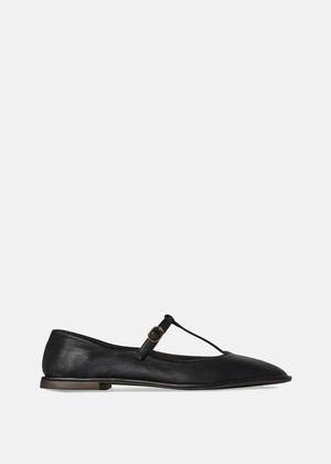 Lambskin square T-strap flat shoes in black with a squared toe and adjustable buckle closure. Finished with a durable rubber sole. 100% Lambskin Leather Made in Italy.