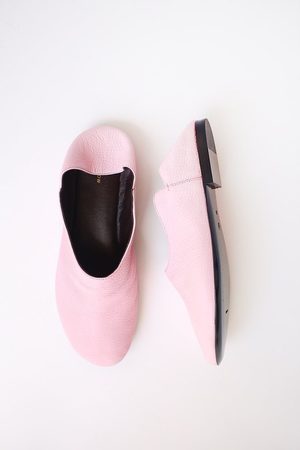 The Row FW18 /// Soft slightly pebbled leather slippers in dusty pink. Designed to be worn fully on the foot, or the heel can be folded down and worn as a slide. Features a high vamp, rounded toe box, black leather lining, stacked heel, and notched sides. - Crackled Leather Slipper - Flat stacked heel - Round toe box - Rounded notched profile at top opening - Slip-on Style Option - Heel measures approximately 0.5" - Fully lined in contrasting smooth black leather - Leather outsole in glossy black with tonal rubber heel tap - Tonal pink stitching throughout - Gold tone stamped logo2 at insole - 100% Leather - Made in Italy Runs true to size.