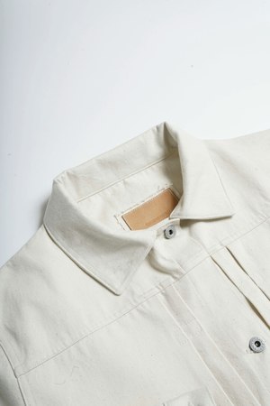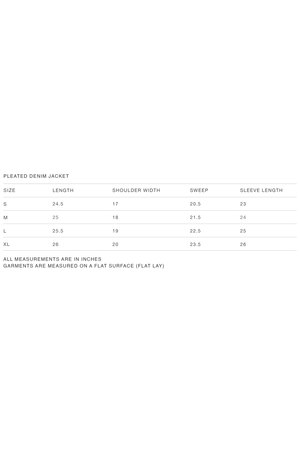 This pleated denim jacket from Saturday Project is crafted from 13.5 oz. Japanese organic cotton denim and features brushed nickel buttons and rivets. The jacket has a slightly cropped silhouette, flat felled seams throughout, and a genuine leather patch. Garment origin: Vancouver, Canada. Fit Note: This garment fits true to size. If youre in between sizes or prefer a relaxed fit, please size up. Model is 510 and wearing a size Large.