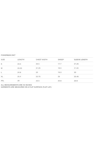A heavyweight crewneck sweater built for coastal mornings and quiet evenings by the sea. Knit from 100% cotton and crafted in Peru, this garment blends old-world durability with a refined, modern silhouette. The chunky ribbed texture adds structure and warmth without the weight of wool. Designed with generous sleeves and a relaxed fit through the body, it layers effortlessly over a tee or under a jacket. Breathable, resilient, and naturally soft a sweater meant to be worn hard and loved forever. Comes pre-washed. - Inverted Fishermans Rib Knit Body - 1 1 Ribbed Neck, Cuff and Hem - Heavy Gauge 3 100% Cotton - Branded Neck Label - Made in Peru Fit Note: This garment fits true to size. If youre in between sizes, we recommend taking the smaller of the two as this garment is designed to be slightly oversized. WHY MADE IN PERU? While we take great pride in producing much of our collectsion here in Canada, some garments call for a different kind of expertise. These sweaters were made in Peru not as a compromise, but as a conscious decision rooted in quality and tradition. Peru has a long-standing heritage in cotton and knitwear production. The craftspeople we work with specialize in heavyweight cotton knitting, using time-honoured techniques that have been passed down through generations. The result is a sweater with unmatched structure, softness, and durability one that would be impossible to replicate domestically without sacrificing quality or accessibility. Producing these in Peru allows us to honour both craftsmanship and sustainability: we work directly with a small, ethical factory, ensuring fair wages, safe working conditions, and the best quality raw materials possible.