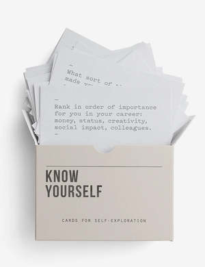 60 prompt cards designed to help lead you through the important task of knowing yourself a little better in life. It can be hard to understand who we really are: what we want, how we feel and why we react as we do. This lack of self-knowledge can lead us into unhappy relationships, unsatisfactory jobs, and unsustainable spending habits. No wonder Socrates summed up all the counsel of philosophy in just two words: 'Know Yourself'. These Know Yourself Prompt Cards from The School of Life are designed to assist us in a journey of self-knowledge. They present us with a range of ideas and questions that encourage self-reflection, allowing us to become a little more aware of what we really need and what our priorities and potential might be. Each card carries an exercise on one side and a piece of analysis on the reverse to help you gain insight and claritys on that ever elusive subject: yourself. Example Cards Q: If I knew I couldnt fail, in my professional life, Id try to... A: We are often so scared of being humiliated by the gap between our aspirations and our reality that we dont even dare to voice any aspiration - thereby conclusively ensuring that it can never come true. We owe it to ourselves to state what we deep down feel we could do and be - even if it never comes right. Q: What sort of things have made you envious recently? A: Were taught to be appalled by envy and never to feel it. But the things and people we envy in fact provide us with a very important map of our desires - which can teach us vital clues about ourselves. Keep a diary of envious feelings; and allow an autobiography of your future to emerge from it. The design is graphically minimal, using neutral colours and a nostalgic Swiss 1950s typeface to set the tone for uncluttered thinking. How to Use the Cards You might: - Lay out the cards on a table and contemplate the questions at hand. - Go through one card each day to fully focus on each question and encourage long term self reflection. - Note down with a pen and paper some of the changes you would like to make and inner milestones you would like to reach moving forward. Details: - 60 cards in box - By The School of Life London - 104mm x 73mm x 36mm