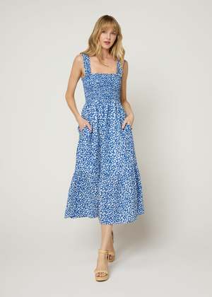 The dress that flirts so you dont have to. With a smocked bodice that hugs in all the right places, ruffled straps that bring just the right amount of drama, and a breezy two-tier skirt that practically floats, this midi dress is equal parts charm and ease. Available in womens regular and plus sizes, its designed to fit and flatter every body. Made from lightweight, breathable deadstock cotton and partially lined with organic cotton, its the perfect blend of romance and responsibility. The gathered waist creates a flattering silhouette, hidden side pockets add a touch of practicality, and the effortless design makes it just as perfect for strolling through the city as it is for dancing under the stars. Ethically made in Los Angeles, because your wardrobe deserves a love story too. Measurements: Lura is wearing size X Small Height: 59 Bust: 32 Waist: 24 Hips: 35