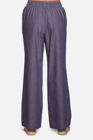 Crafted with comfort and style in mind, offering a breezy silhouette that's perfect for warmer weather adventures. Featuring convenient side pockets and an adjustable waistband for a customizable fit. - Color: Chambray Mini Stripe - Fit: High rise wide leg pant - Waistband offers an adjustable drawstring - Functional side pockets with no back pockets for a chic look - Made in NYC - Fine poplin: 100% cotton - Hand wash cold, no bleaching, no tumble dry, lay flat to dry, dry cleanable - Style #: WVBC537B