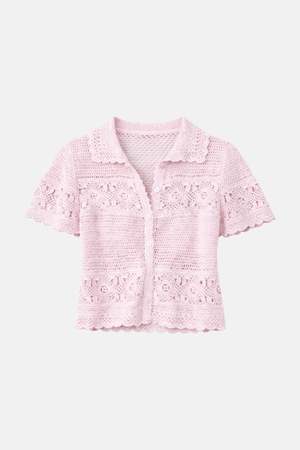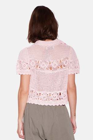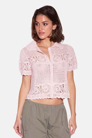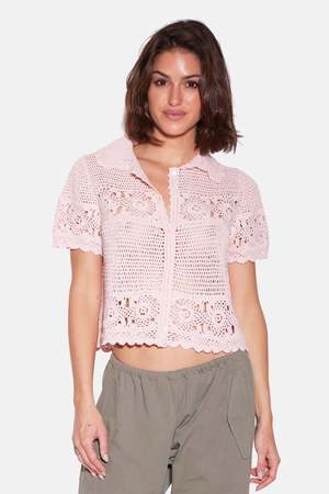 Molly is the throw-on-and-go top that makes everything feel cuter, from linen pants to low-rise denim. - Color: Pale Pink - Slim to Relaxed fit, runs true to size - Collared neck with a V neckline - Crochet detailing throughout the body, sleeves, and hems - Button-down closure - Made in NYC - Made from 100% Cotton - Do not machine wash, do not tumble dry - Hand wash or dry clean suggested - Style #: BCWT501HC