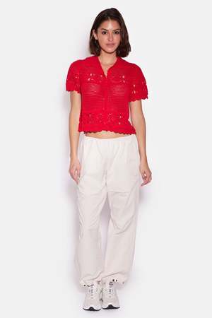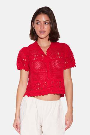 Molly is the throw-on-and-go top that makes everything feel cuter, from linen pants to low-rise denim. - Color: Red - Slim to Relaxed fit, runs true to size - Collared neck with a V neckline - Crochet detailing throughout the body, sleeves, and hems - Button-down closure - Made in NYC - Made from 100% Cotton - Do not machine wash, do not tumble dry - Hand wash or dry clean suggested