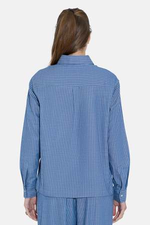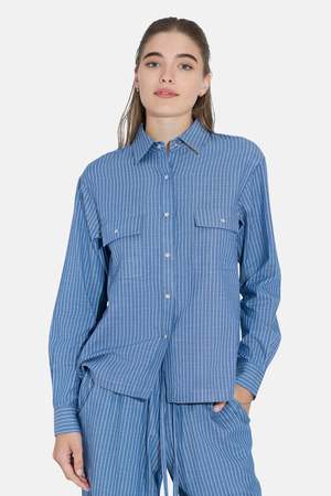 Tailored and effortless, the Coco Overshirt is designed in a lightweight striped cotton with a relaxed, slightly oversized fit. It features a spread collar, pearl button closure, and double chest pockets. Button it up, wear it open, or pair it with the matching Georgica pantthis overshirt does it all. Color: Lt Blue Stripe 100% Cotton Made in NYC Style #: WVBCW23SHRT88WN