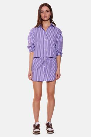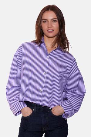 This crisp, structured crop button-down features a cropped boxy silhouette, button-up closure, wide spread collar, and 3/4 sleeves with adjustable buttons for a rolled-up look. Color: Purple/Pink Stripe Made in NYC from a super fine poplin. Composition: 100% Cotton Hand wash cold, no bleaching, no tumble dry. Lay flat to dry. Dry clean recommended. Style #: WVBCW2410T Mpn: WVBCW2410T Sku: TILWF25-50