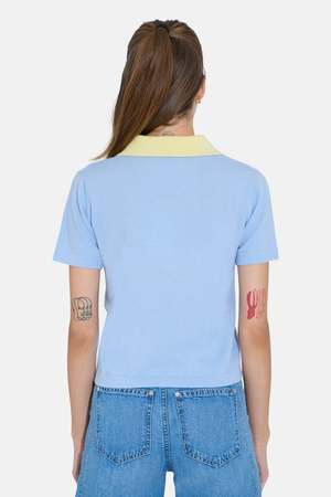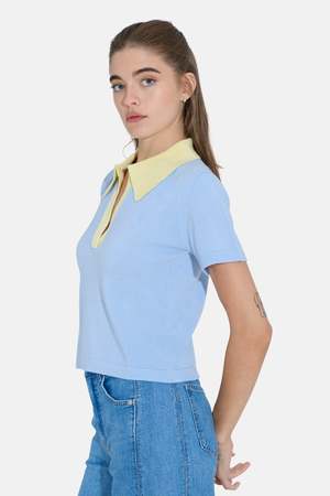 The Tate Polo is crafted from soft, lightweight cashmere with a cropped silhouette and a soft yellow collar detail that pops against the baby blue body. - Contrast color - 100% cashmere - Short sleeve - Relaxed fit