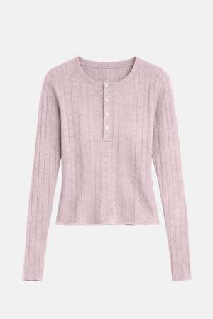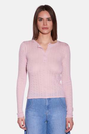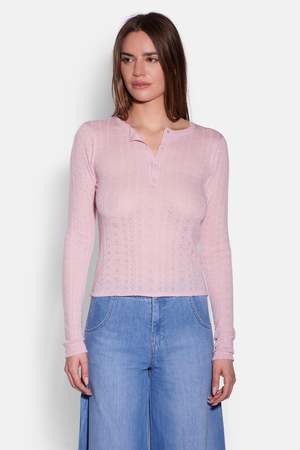 Your favorite henley, with a feminine twist. The Sylvia Pointelle is soft, airy, and delicately detailedperfect for when you want something a little sweeter. - Color: Pink - Lightweight pointelle knit - Slim, flattering fit - Button henley front - Style #: W25-011