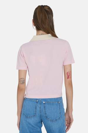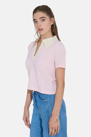 The Tate Polo is crafted from soft, lightweight cashmere with a cropped silhouette and soft ivory collar detail that pops against the pale pink body. - Contrast color - 100% cashmere - Short sleeve - Relaxed fit - Style #: W25-017-CMB