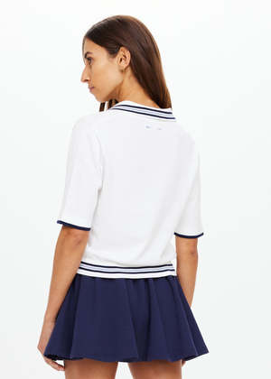 The Archie Polo brings a clean, prepped-up ease to everyday styling. - Collared knit polo shirt in white - Organic cotton fabrication - Striped navy and dusty blue ribbings at front placket, collar and hem - Embroidered arrow logo2 in dusty blue at back neck Age group: Adult.
