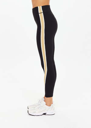 A sculpted midi pant with sharp side detail. High-rise 25" length midi pant in black. Firm and supportive in our recycled rib fabrication. Contrast tan panel with cream binds at sides. Printed arrow at the back in cream. Type: Leggings.