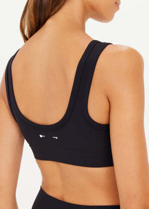 Find your zen in our Peached Harley Bra. - Scoop front and back neck bra in black - Mid coverage - Removable bust cups - Recycled soft peached with a brushed handfeel - Printed arrow logo2 at back - Breathable, moisture wicking fabrication