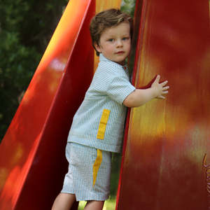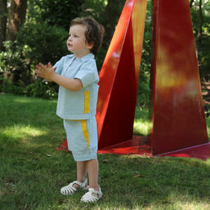 The first Ti A Ci BANi Ki Ds collectsion was created on a whim by designer Tia Cibani in New York, taking her experiences working in women's wear and inspiration from her North African heritage to create an inventive and functional collectsion. With a focus on textiles and textures, she has collaborated with artisans and reputable mills to create unique and imaginative designs for boys and girls from baby to age 16. - Classic shorts - Contrasting ribbon details - Metal hook and bar closure and zip closure at the front - Back pockets - Adjustable elasticized waistband 100% Cotton, Trim: 100% Cotton Machine wash at 30C, line dry. SS23-KB-SR34S