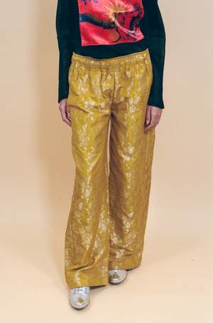 Handwoven silk brocade pants in mustard yellow with floral jacquard motifs in silver throughout, shimmering like the sun at golden hour. They have long, straight wide legs with a relaxed fit for unrestricted movement, and side slit pockets for extra comfort. Slip-on style with an elasticated waistband and drawstring. Measurements (laying flat, with stretch indicated): Size Small: Waist 28"34", Hip 46", Rise 11", Length 41", Inseam 30" Size Medium: Waist 30"36", Hip 48", Rise 11", Length 42", Inseam 31" Size Large: Waist 32"40", Hip 50", Rise 11", Length 42", Inseam 31" Maya is 5'10" and a size extra small, and wears size Small with the Hand Printed "Once in a Blue Moon" Top, Long Sleeve Bellevue Tee in Mauvewood, Satin Theatre Slipper in Blush, and Long Gota Earrings in Black. Material: 60% silk, 40% cotton. Dry clean only. Made by hand in Ahmedabad, India.