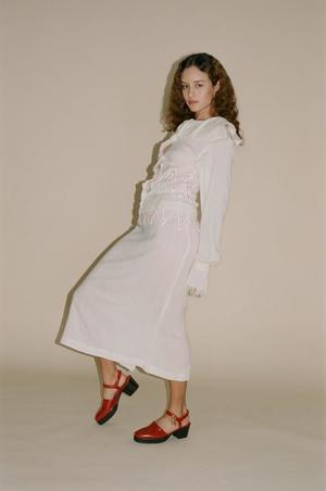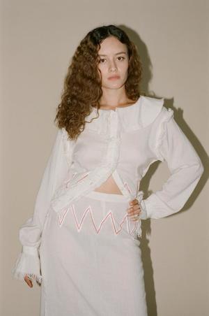 Tigra Tigra Zuzu Hand Embroidered Tropical Wool Skirt in White / Red - Hand-loomed tropical wool skirt with hand-embroidered sikal stitch. - Made in Ahmedabad, India by a fair trade independent women's cooperative. - Closes with a hidden zipper. - Raw edges. - Fabric: 100% wool