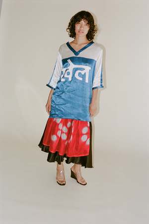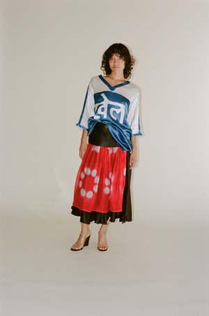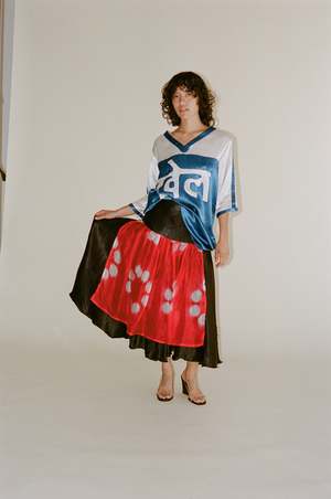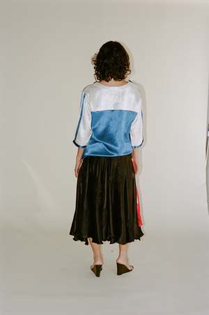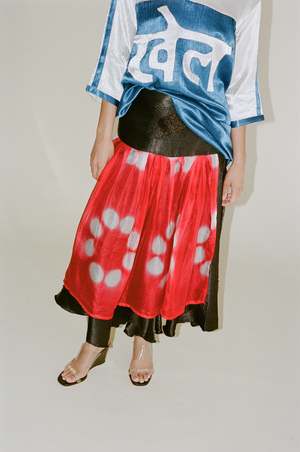 Hand-woven raw silk skirt with sheer silk kota panel overlay. Features a dangerously high slit. Made in Ahmedabad, India. 100% Raw Silk with 100% Silk Kota Pane.