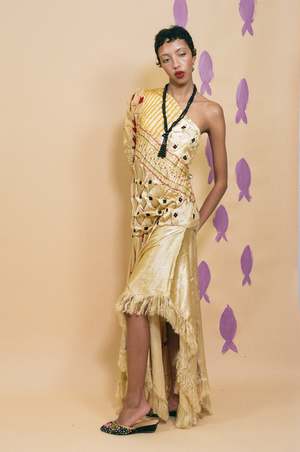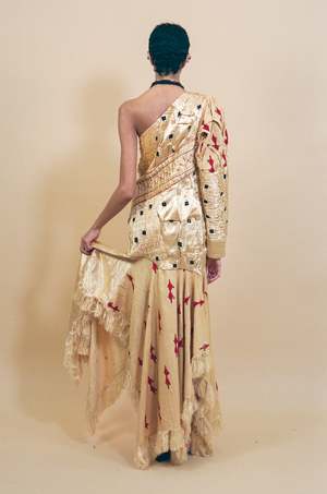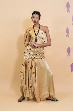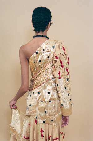 One shoulder midi dress in champagne coloured silk mashroo with hand embroidery of fish and flowers, and textile manipulation techniques throughout. Invisible side zip closure. Relaxed upper with a voluminous shoulder toward a more tapered sleeve. The skirt tier is designed with asymmetrical lengths adorned with frayed edges, adding movement to an otherwise structured silhouette. An incredibly special work of art sure to be a sight for sore eyes once worn. Measurements (laying flat): Size Medium: Open shoulder, bust 36", length 59", sleeve 26", hip 38". Maya is 5'10" and a size extra small, and wears size medium (clipped in the back to close) with the Farol Necklace. Material: 60% silk mashroo hand woven in Old Patan, 40% cotton. Made by hand in Ahmedabad, India.
