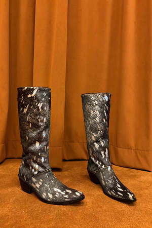The Tall Jackie Boot from et Tigre is made from genuine pony hair and leather; each pair reveals its own pattern and tone, ensuring no two are exactly alike. Designed with a tall, sculpting shaft and pointed toe. Fit | Fits true to size. If between sizes, we recommend sizing up. The natural leather will soften and mold comfortably with wear. 1" stacked heel, 14" tall, including heel. Composition | 100% Pony Hair and genuine leather, leather lining and wood sole Crafted in Peru.