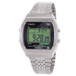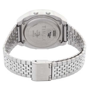 Silver-tone stainless steel case and bracelet with a fixed silver-tone stainless steel bezel. Digital dial with analog display type and luminescent INDIGLO. Quartz movement with scratch-resistant acrylic crystal. Pull / push crown and solid case back. Square case shape with 36 mm case diameter and 11 mm case thickness. Band width 18 mm with self-adjust clasp. Water resistant to 30 meters / 100 feet. Functions include date, day, hour, minute, second, and alarm. Part of the Timex 80 collectsion. Model: TW2V74200YB / TW2V74200.