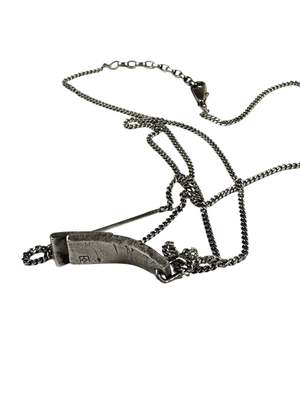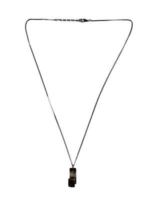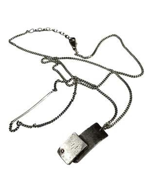 The Overlap Pendant with Ruby Necklace from title of work is handmade in their Lower East Side studio in New York City. This necklace features a 1" sterling silver plate collage hanging from a 24" curb chain. Each piece is constructed using reclaimed sterling silver, which is then oxidized to create a darkened finish that will develop a lighter, contrasting patina over time. Materials: Sterling silver, ruby Color: Silver Dimensions: 24" length Construction: Handmade Origin: New York City