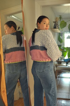 The Toast & Yarn Chunky Knit Cardigan is the ultimate piece to have you feeling cozy-chic! This handknit sweater features a truly unique colour way that is sure to invigorate and enhance any outfit! The chunky knit look is quite playful while also ensuring you're staying comfortably warm throughout the day. This is a truly special piece that you'll be looking to turn to day after day! Sizing Notes: This sweater has an over-sized fit with dropped shoulders and relaxed wide sleeves. We recommend ordering your usual size. If you require measurement specifics, please send us an email. Vero is wearing the S/M here 100% Merino Wool Washing Instructions: Hand wash in cool water. Lay flat to dry. Exclusive to Victoire Handmade in Canada