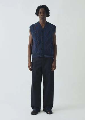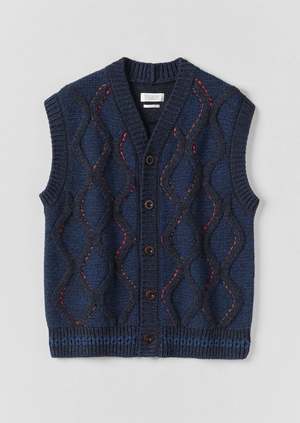 This button up vest from Toast is hand-embellished, tracing the cable design with vibrant stitching. Shaped with a V-neckline and finished with ribbed edges, the tank fastens with corozo buttons. Argyle detailing runs across the hem. DETAILS + FIT - 69% wool, 31% cotton - Easy fit is true to size; model wears size M - Made in Turkey