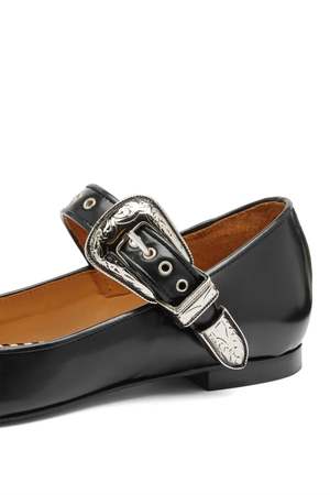 Toga Pulla shoes aesthetic was born from a desire to fuse contemporary western styles with traditional Japanese design, detailing, and materials. Toga's footwear takes inspiration from vintage elements, brought up to date with contemporary shapes and bold prints as seen with the Polido Mary Jane Black. Toga Pulla Black Mary Jane Buckle Ballerina Flats. Polished leather Mary Jane-style ballerina flats in black. Square toe. Adjustable signature buckle strap at top. Eyelets and graphic hardware. Padded leather footbed. Grained leather and suede lining. Stacked leather heel with rubber injection. Polished leather sole. Colour: Black. Composition: Leather. Made in Portugal.