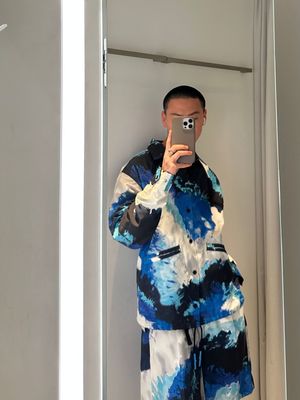Blue, white and black tie dye printed baseball coach style jacket, with western inspired embroidery along shoulders and pockets. Snap front closure with drawstring at waist. Vendor Colour: Black White Blue Vendor style: TV01-FC320 Fabrication: 100% Polyester. Lining 100% Polyester. Embroidery Thread 100% Rayon. Made in Japan.