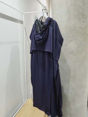 Oversized poncho style, hooded dress with side snap entry. Snap at front collar can be opened to transform the neckline from a crewneck to a V-neck. Hood with tie details. Vendor Colour: Navy Vendor style: TA92-FH084 Fabrication: Main 100% Polyester. Made in Japan. **All Archive Sale Pieces are considered a FINAL SALE!!! No Exchanges or Refunds! Description tag Oversized poncho style, hooded dress with side snap entry. Snap at front collar can be opened to transform the neckline from a crewneck to a V-neck. Hood with tie details.