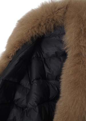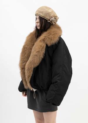 Fox fur collar goose down jacket with a cropped, oversized fit. Features an elastic hem and cuffs with a quilted interior. Length: 60cm, Chest: 64cm One size Imported Final Sale If this item is a pre-order, it will ship in 1 to 2 weeks.