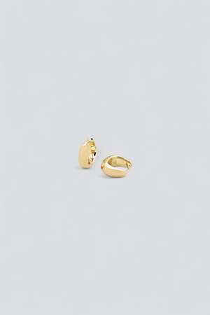 Gold Ice Huggies from Tom Wood. These polished earrings are designed to comfortably hug the ear tip. All products are made with 100% recycled materials. - 1 micron 18K gold plated / 925 sterling silver - Made in Thailand - Length: .41" / depth: .2" / height: .41"