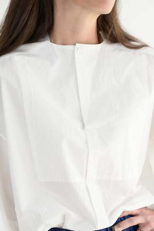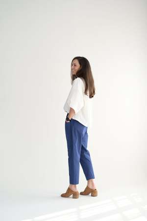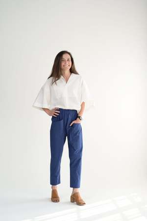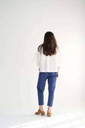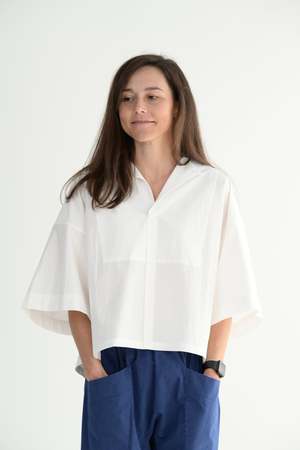 The TooGood Cook Top is crafted from a lovely Japanese cotton poplin. This top features a boxy cut, elbow-length sleeves, and a front button closure. Emma is wearing size 0/XS.