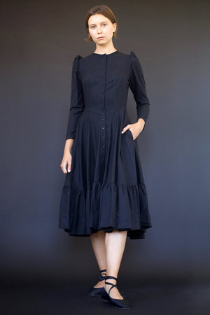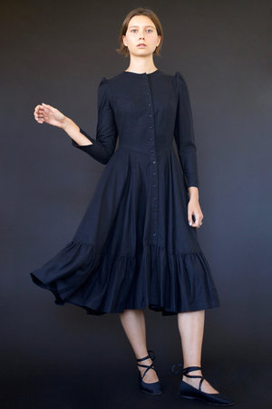 Long, leg of mutton sleeve dress. Fitted bodice with princess seams, tagua nut buttons, flared skirt with ruffled hem. Offered in black, red and cream (click here to purchase in red or cream) 100% Silk Noil (Raw Silk) *please note this dress runs small XS- 42.5" length, 30" bust, 24" waist, 13" across shoulder, 21.5 sleeve S- 43.5" length, 32" bust, 25" waist, 13.5" across shoulder, 22.5 sleeve M- 44.5" length, 34" bust, 26.5" waist, 14" across shoulder, 22.75 sleeve L- 45.5" length, 36" bust, 28" waist, 14.5" across shoulder, 23 sleeve Always made in Los Angeles, CA Photography by Richard Ramirez Jr. Model Louise Nouvellon